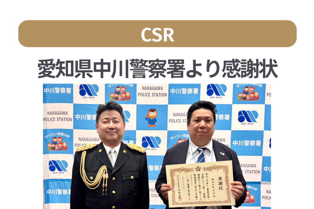 令和8年1月15日、「令和8年 愛知県中川警察署 感謝状贈呈式」が執り行われ、中川警察署長より、弊社に対し感謝状が贈呈されました。