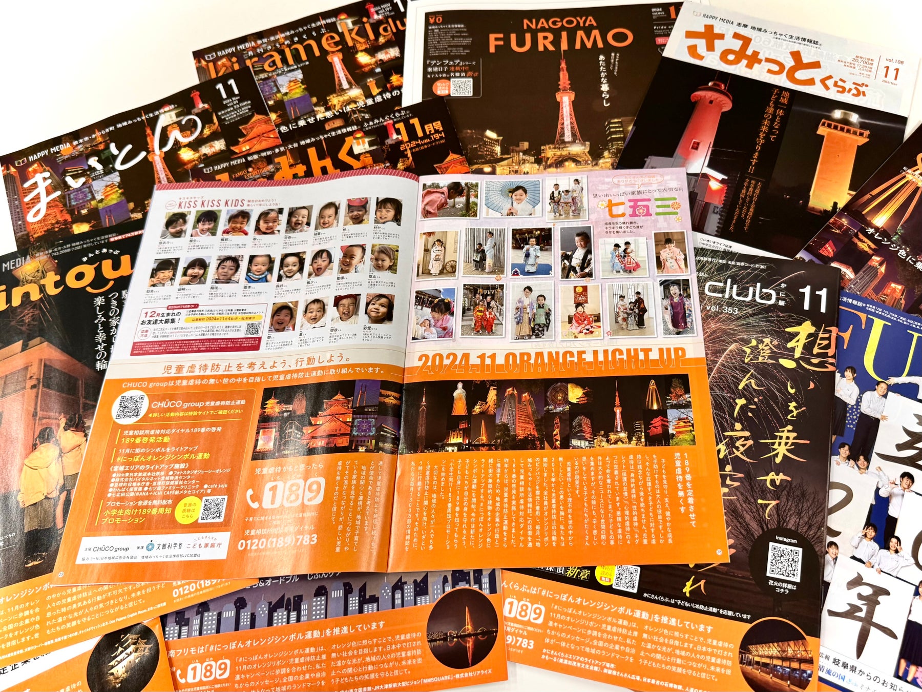 当社では全国35都道府県で182誌1,340万部以上のポスティング型情報誌『地域みっちゃく生活情報誌®』を展開しています。11月号では通常の啓発に加え、表紙でCHUCOgroup児童虐待防止運動に関するアナウンスを実施いたしました。